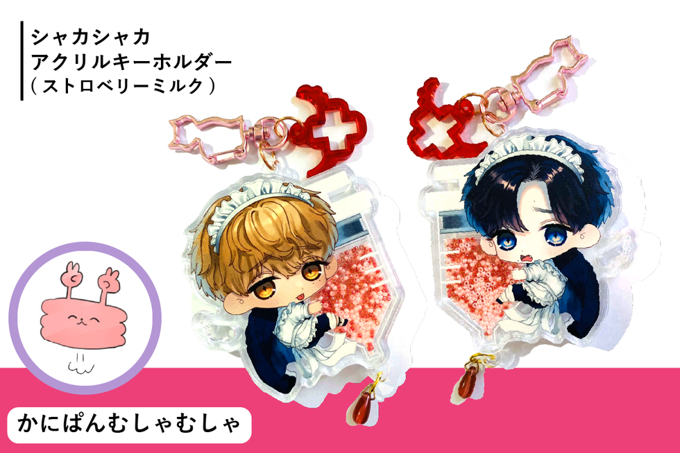 作家リターン枠「かにぱんむしゃむしゃ」 【チョコとハルミニ色紙&シャカシャカアクキー(ストロベリーミルク)】/¥15,000/限定1点 アクリルガッシュで描画したミニ色紙(136×121mm)と、ビーズ入りシャカシャカアクキーのセットです。 ※お届け予定月は前後する可能性があります。